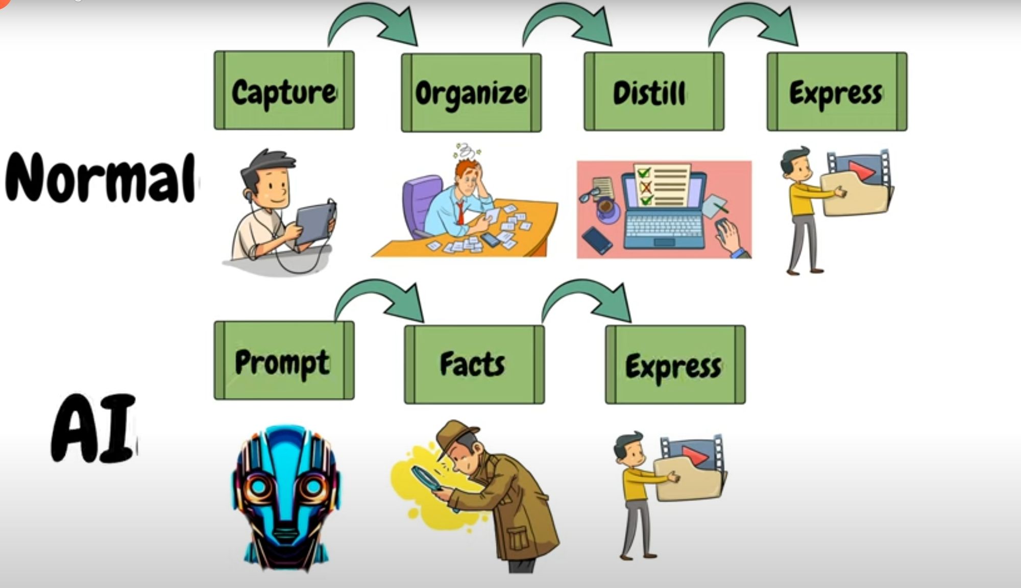 Despite this, there are still two paths of content creation: the normal method and the AI method. The normal method involves capturing your ideas, notes, and knowledge, organizing them in a way that makes sense to you, distilling them down to their essence, and then expressing them in a way that is meaningful and valuable to your audience.